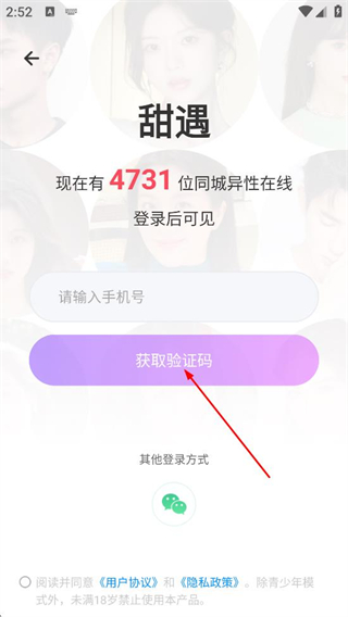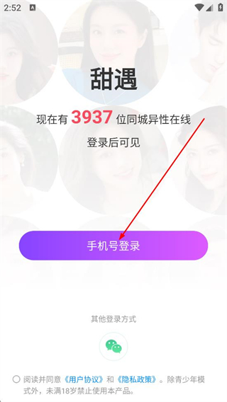 2、随后在甜遇登录选择页,点击手机号登录选项,进入登录页面。