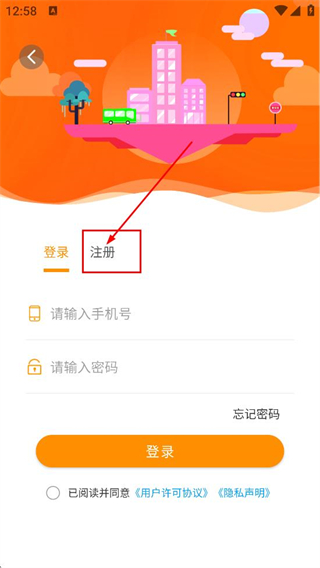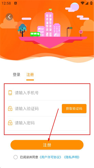3、在注册页面,填写手机号、验证码、密码后,点击注册,完成账号登录操作。