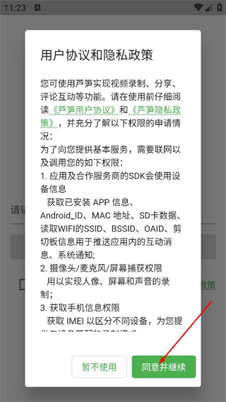 1、在用户协议和隐私政策弹窗中后,点击同意并继续,进入应用首页。