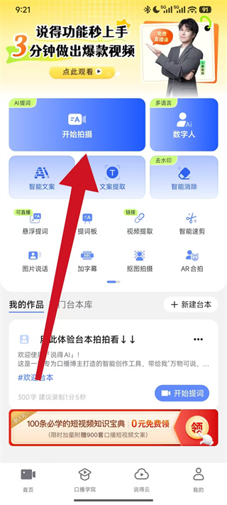 2、降低创作门槛,无需专业拍摄与剪辑知识,核心功能操作简洁直观,内置口播学院提供教程指导,新手也能快速上手,同时支持分镜拍摄、一键成片,缩短出片周期。
