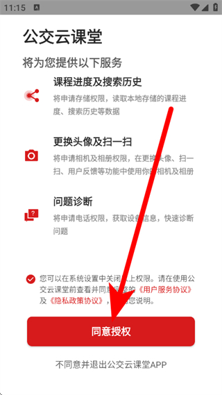 1、打开公交云课堂后,在服务授权页面,点击同意授权,进入登录界面。