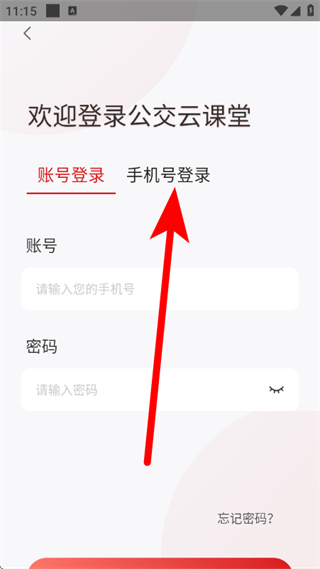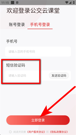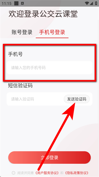 2、在欢迎登录公交云课堂页面,点击手机号登录,切换到验证码登录界面。