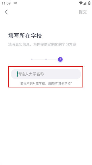 4、进入填写学校页面,在输入框中填写所在大学名称,准备完成信息提交。