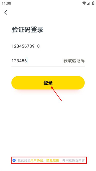 2、将收到的验证码填入对应框,勾选协议后,点击“登录”按钮完成登录操作。