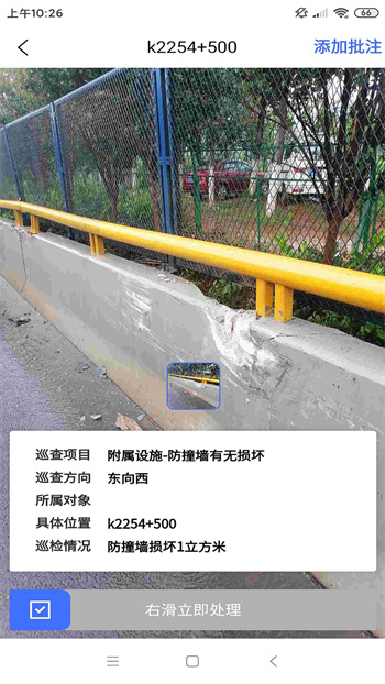 后台自动定位巡检车GPS,绿色是指定绕城路线,红色是周边路段,巡检过程中发现问题,app会自动识别当前的位置桩号和巡检的对象,巡检人员只需要拍摄和描述问题即可。