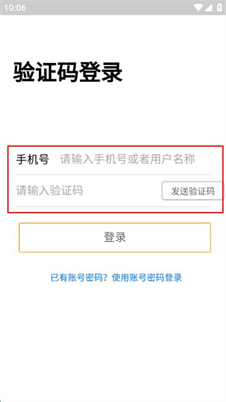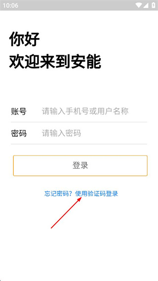 1、在安能的欢迎登录界面,点击“使用验证码登录”选项,切换到验证码登录页面。