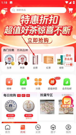 1、在找找茶首页,点击底部的商城选项,进入商城页面。