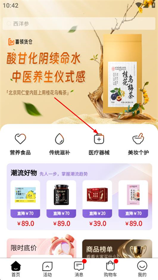 1、在喜领货仓首页,点击医疗器械分类选项,进入医疗器械商品列表页。