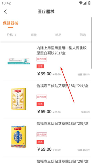 2、在医疗器械列表页,点击目标商品,进入商品详情页。