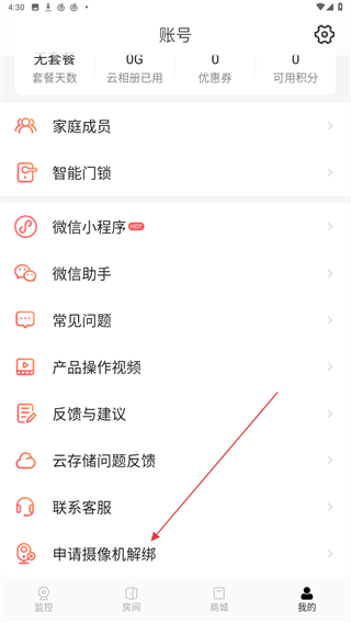 2、进入账号的界面内,向下拉动找到并点击申请摄像机解绑的按钮。