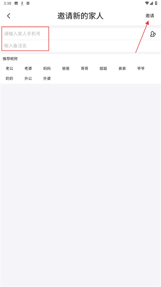4、输入家人的手机号与备注名,确认信息后点击邀请的操作。