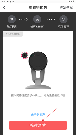 3、点击页面的听到滴声按钮,确认设备进入待绑定的状态。