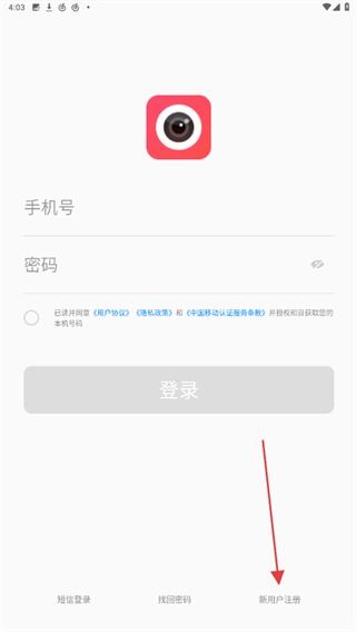 1、打开和目摄像头APP,若未登录进入时点击下方新用户注册的按钮。