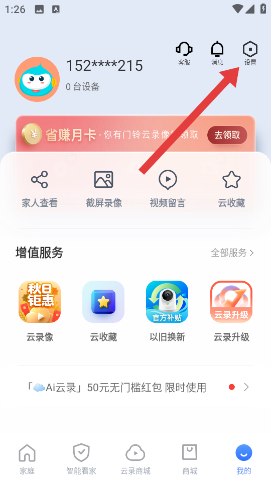1、在360智能摄像机我的页面,点击右上角的设置图标,进入设置界面。
