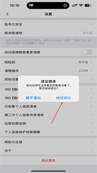 4、在弹出的确认弹窗里,点击继续退出按钮,即可完成退出登录操作。