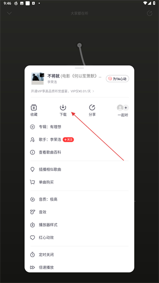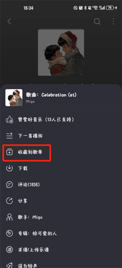 4、可以看到有很多功能我们选择收藏到歌单就能进行歌曲的收藏;