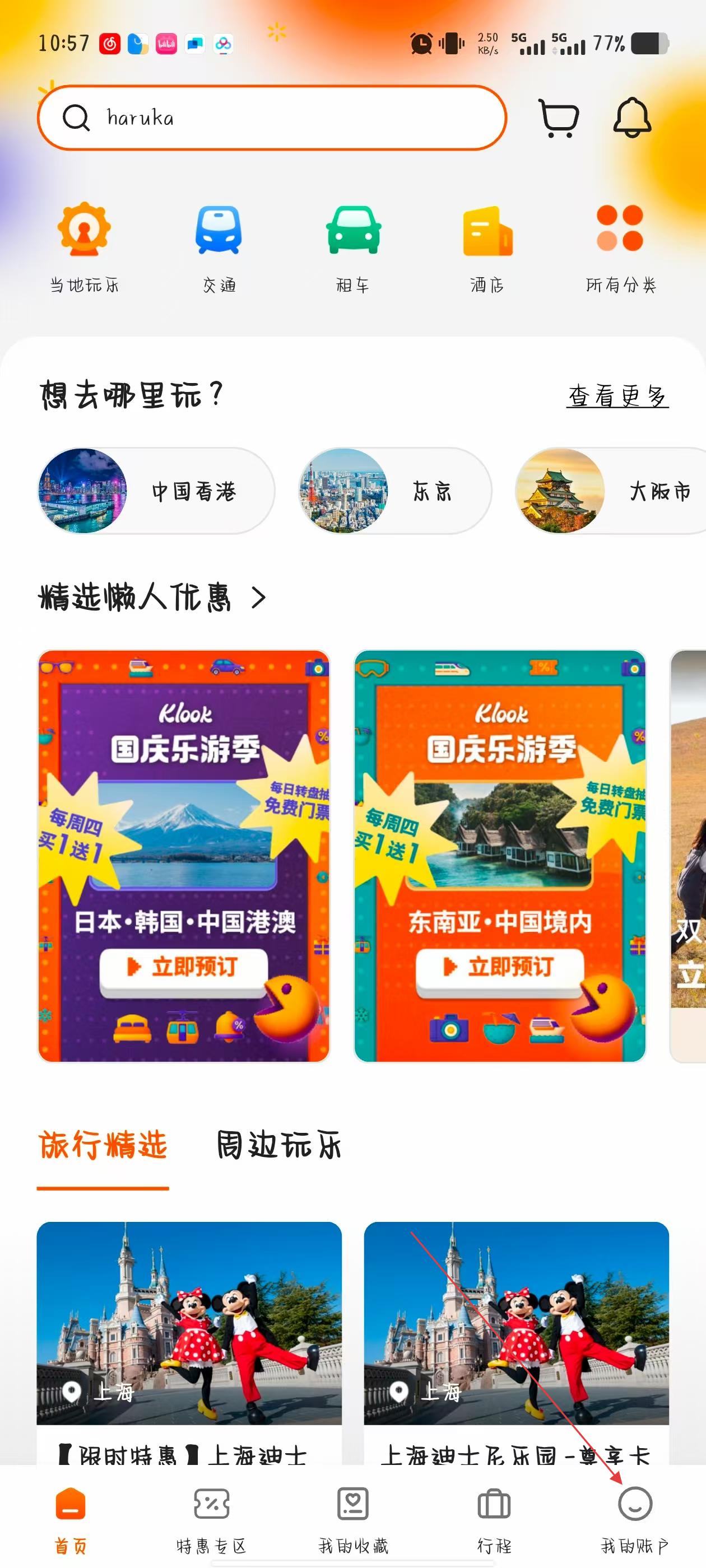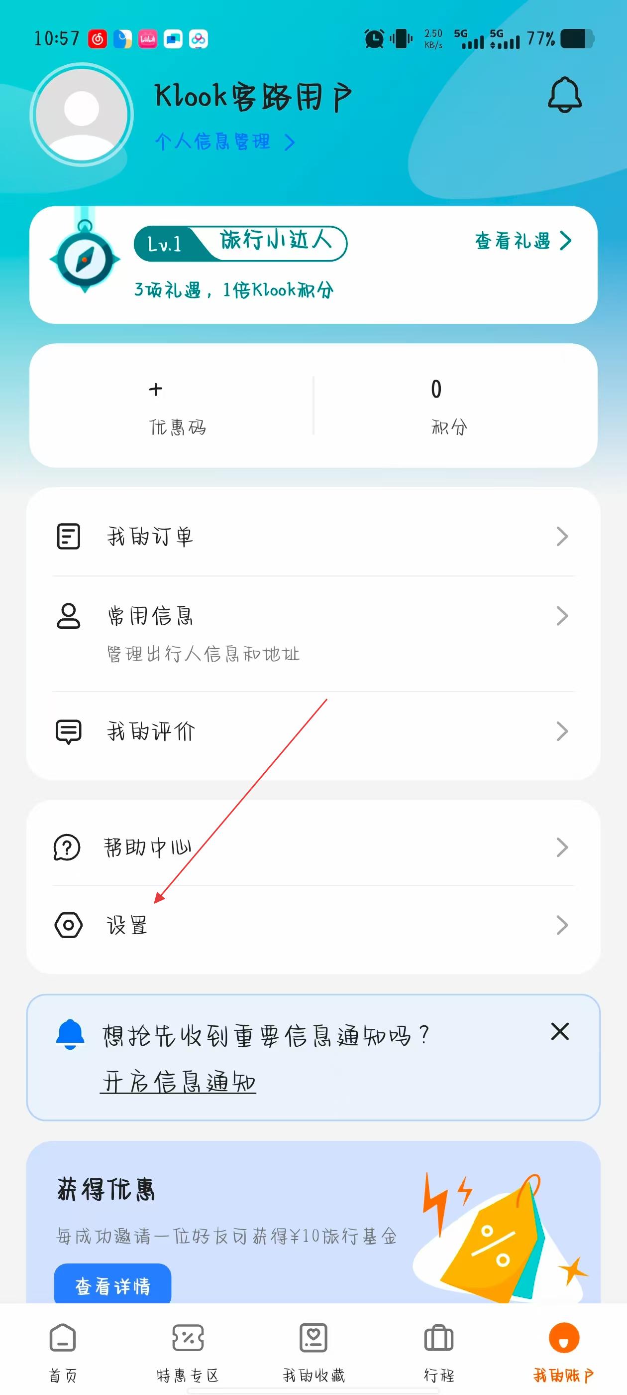 1、打开KLOOK客路旅行APP,点击页面右下角我的图标,进入个人中心页面。