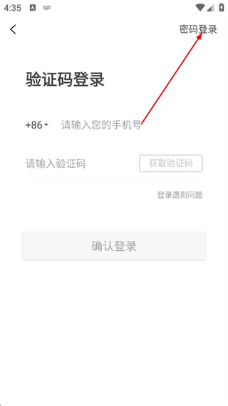 2、在验证码登录页面,点击右上角的密码登录选项,切换至密码登录界面。