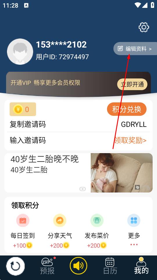1、打开天气预报应用,在首页底部找到我的选项,点击进入个人中心页面。