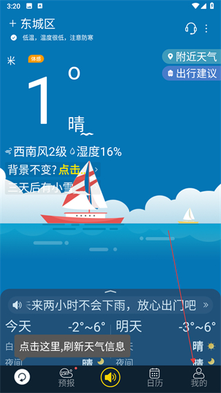 1、打开天气预报APP,点击底部导航栏的我的选项。