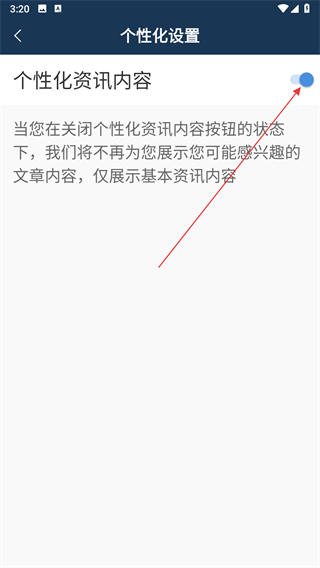 4、在个性化设置页面里,点击个性化资讯内容的开关按钮,将其关闭即可。