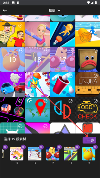 3、在相册页面,选择所需素材后点击下一步按钮,进入视频编辑页面。