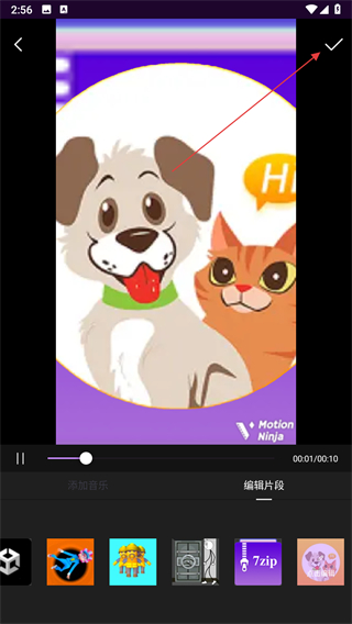 4、对视频进行添加音乐、编辑片段等操作,完成后点击右上角对勾图标。