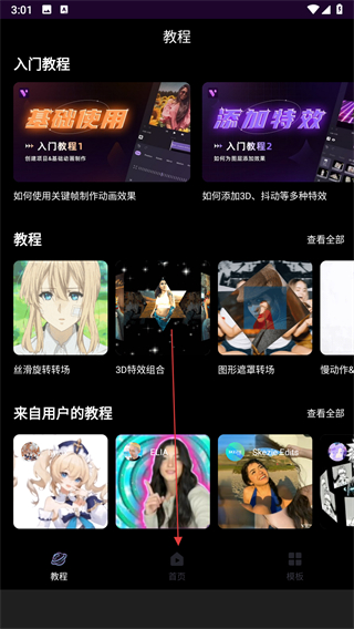 1、打开MotionNinja应用,在教程页面底部点击首页选项,切换到应用首页。