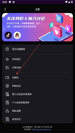 3、在设置界面中,找到兑换码选项,点击该选项弹出会员兑换码的输入窗口。