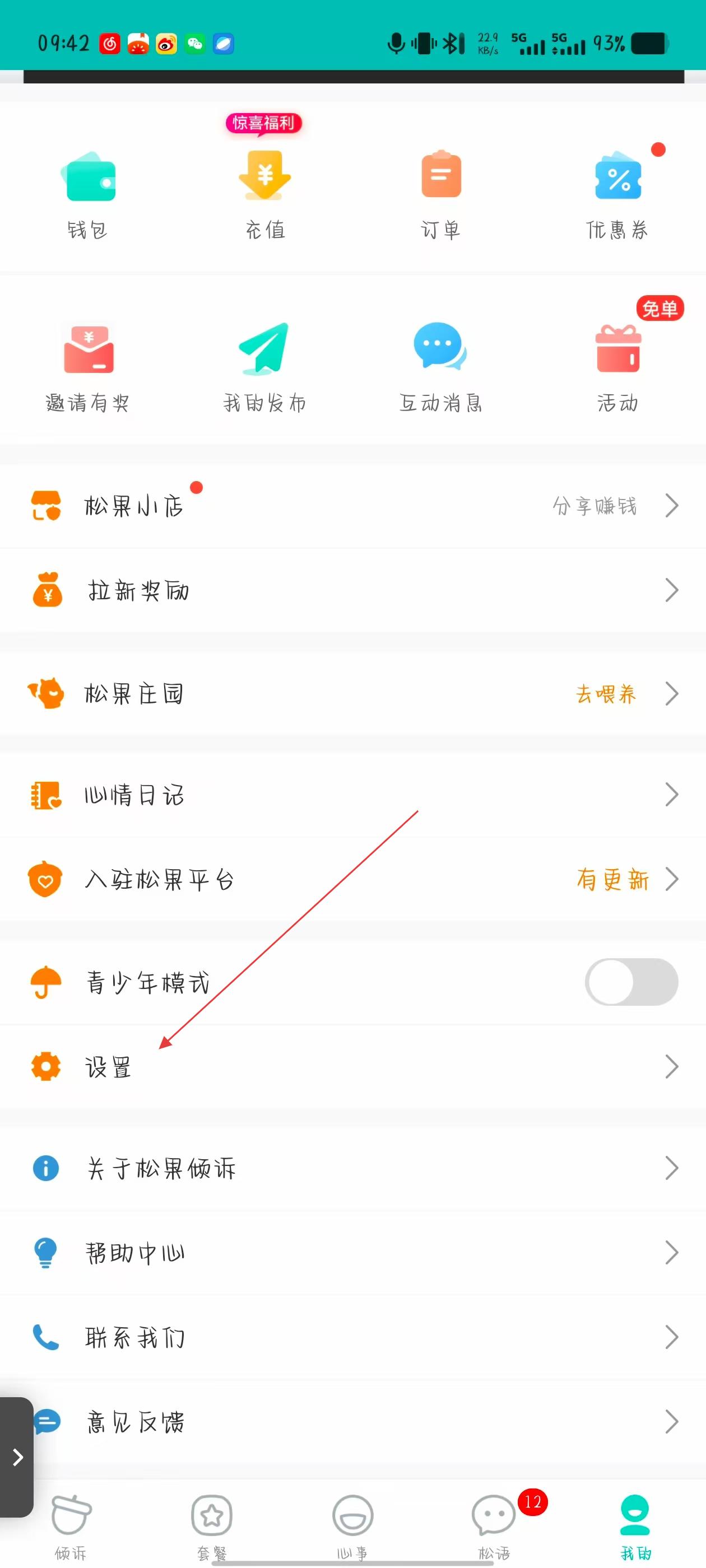 1、打开松果倾诉APP,进入我的页面,点击设置选项,进入设置界面。