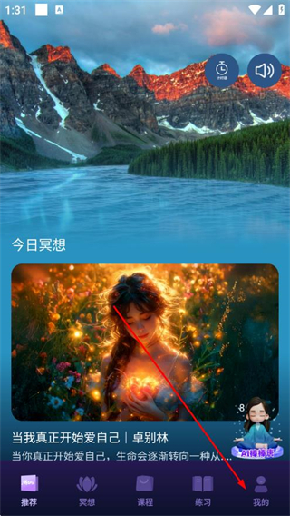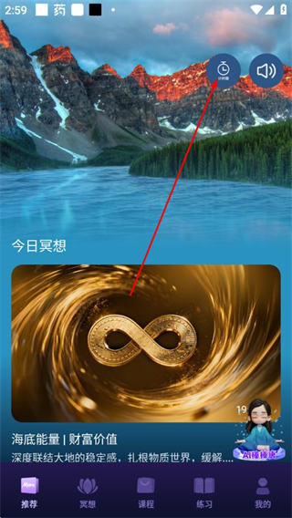 1、在墨尔冥想app的推荐页面,点击右上角的计时器图标,进入计时器设置页面。