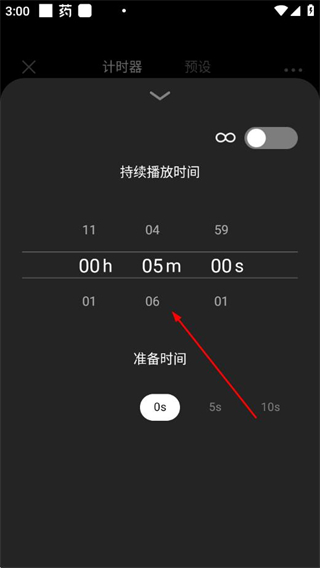 3、在持续播放时间界面,调整小时、分钟、秒数,完成冥想播放时间的设置。