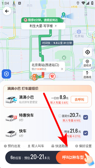 4、在车型选择页面,挑选目标车型,点击底部的呼叫按钮,完成叫车操作。