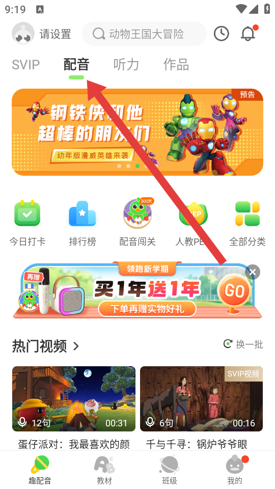 1、打开少儿趣配音APP,我们进入配音的页面,可以往下滑寻找自己需要提取的视频。