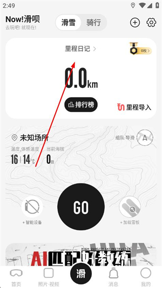 2、在滑行记录页面点击里程日记,进入滑雪轨迹页面。