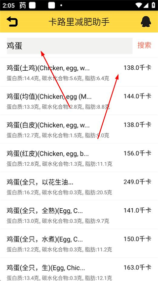 2、在搜索栏输入食物名称,选择对应的食物选项。