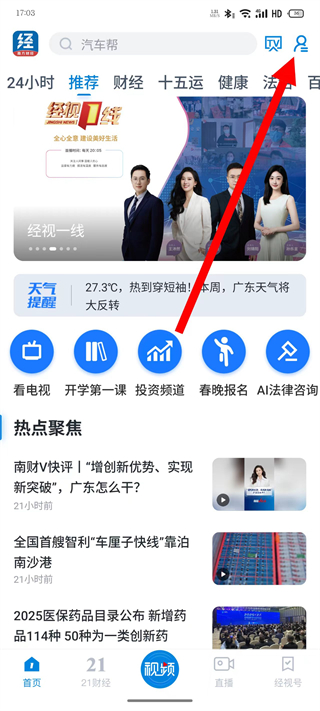 1、打开广东经视频,点击右上角的个人图标,进入个人相关页面。