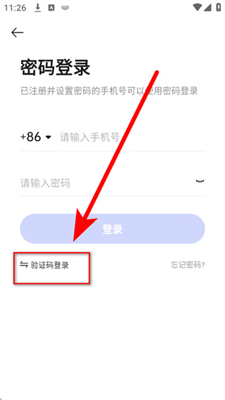 2、在密码登录页面,点击验证码登录,切换到手机号登录注册界面。