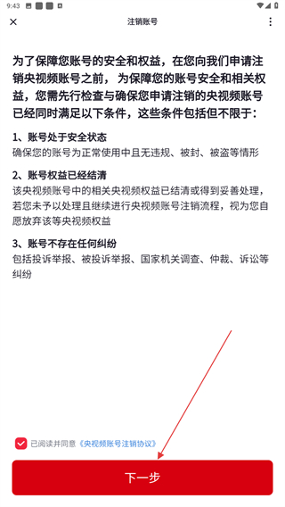 4、进入注销账号的界面内,勾选后点击下一步的按钮。