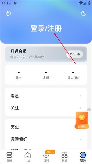 2、在个人页面,点击上方的登录/注册的选项,进入登录界面。