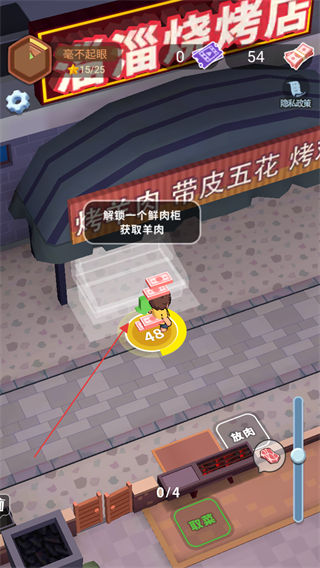 1、站到黄色圈解锁鲜肉柜,获取羊肉食材,为烧烤准备原材料。