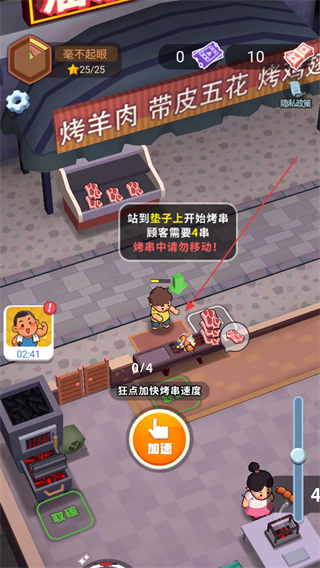 2、站到烤架旁开始烤串,点击加速按钮提升烤串速度,满足顾客4串的需求。