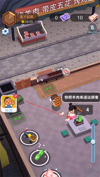 3、烤好羊肉串后,将其送到顾客处完成订单,积累收益。