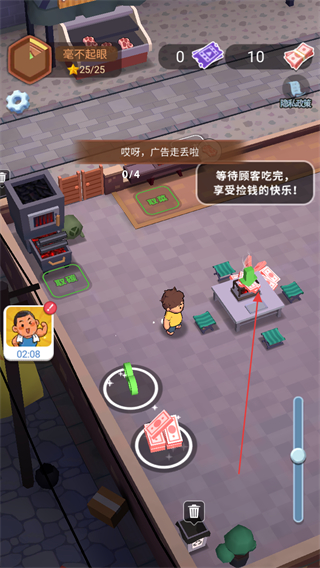 4、等待顾客吃完,拾取桌上的钞票,获取经营收入,推进店铺运营。