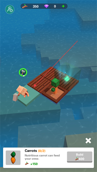 1、角色在木筏上自动收集资源,积累材料以解锁更多建筑,推进建造进度。