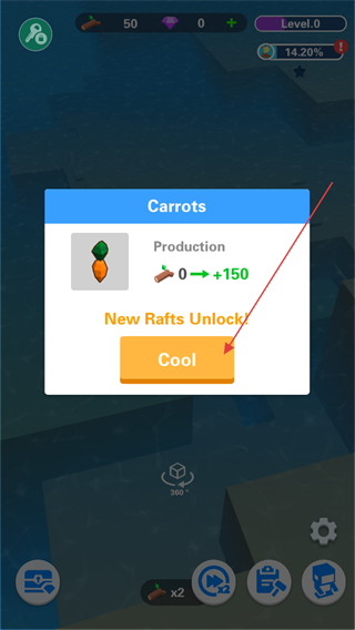4、建造完成后弹出提示,点击Cool确认,解锁新木筏区域,推进通关进程。