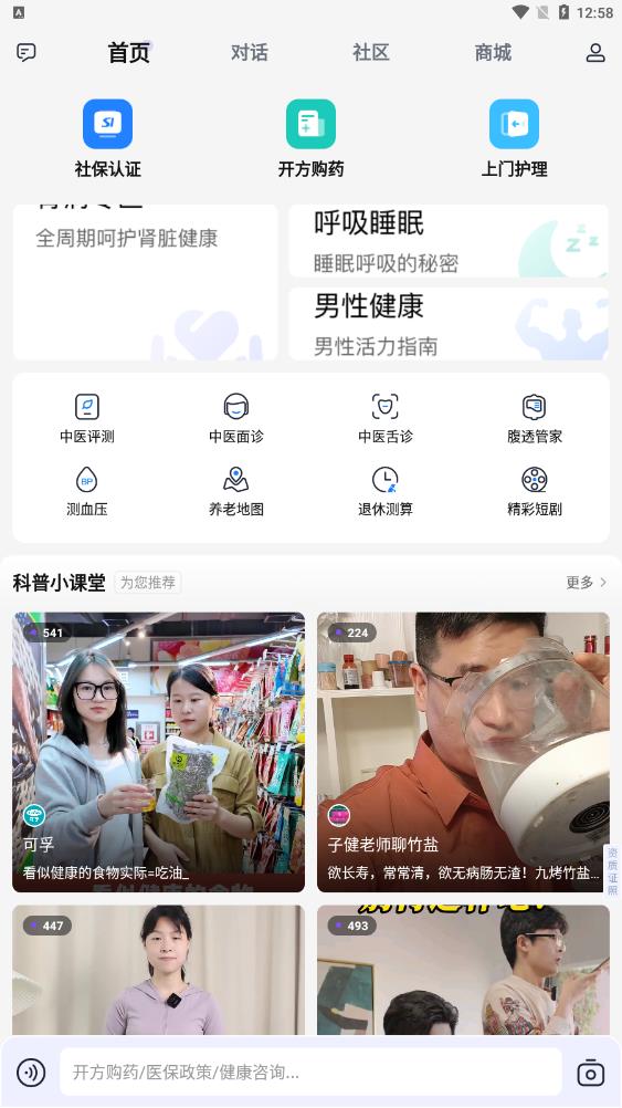 3、呈现多元服务,社保认证、开方购药、上门护理、等功能便捷实用,健康知识涵盖肾脏、男性健康等内容,安行天下等板块丰富退休生活,助力用户享受智慧养老服务。