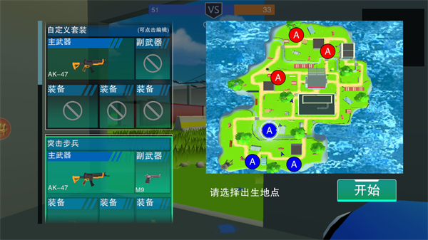 1、在战斗准备界面,选择主武器如AK-47、副武器如M9及装备,点击开始进入对战。