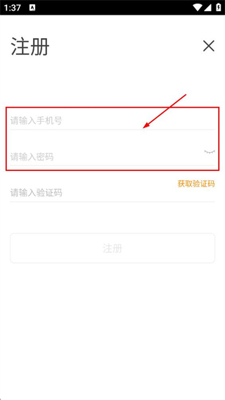 2、进入注册页面后,先依次填写请输入手机号与请输入密码这两项信息。