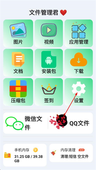 1、打开文件管理君应用,在主界面找到设置选项并点击,进入设置页面。